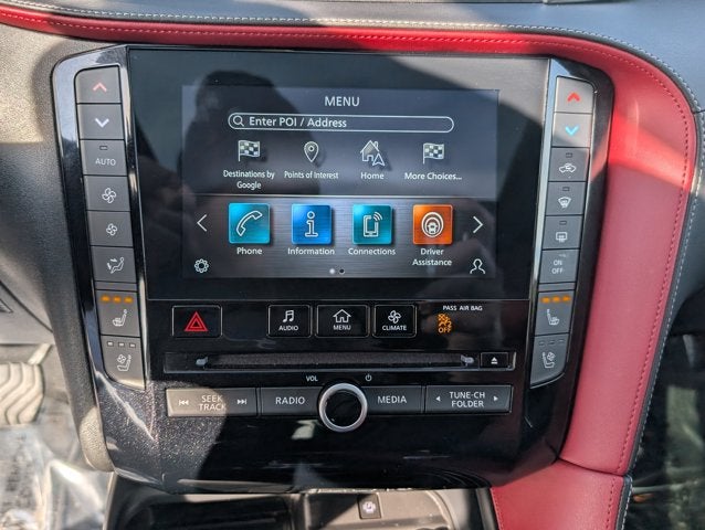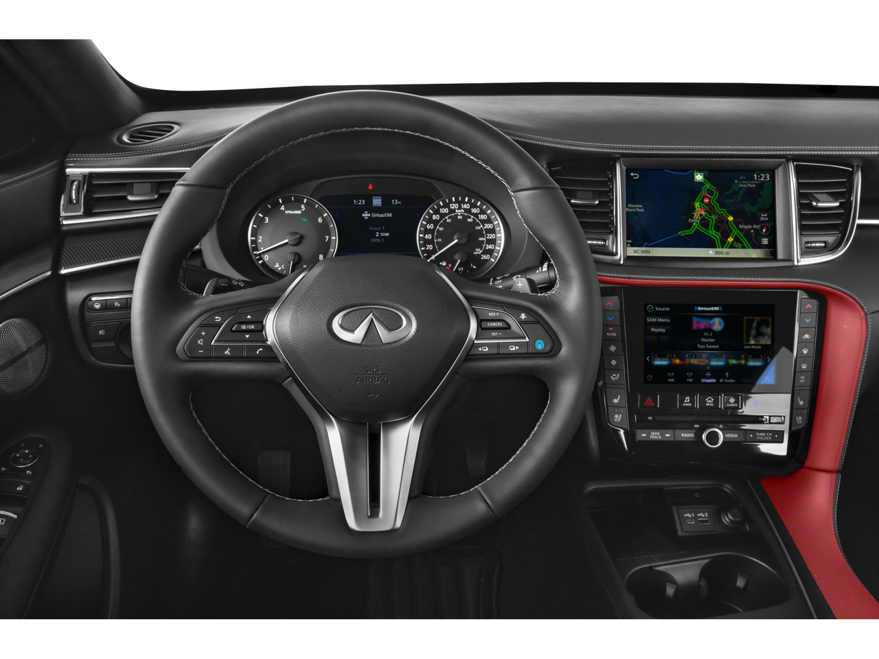 - Radio: Bose Premium Audio System -inc: 12 speakers, metallic speaker grilles on tweeters, INFINITI InTouch, INFINITI InTouch services, INFINITI InTouch dual display system w/upper 8" and lower 7" HD touch screens, wireless Apple CarPlay, Android Auto, HD radio technology, SiriusXM radio w/advanced audio features and 90-day complimentary trial, INFINITI voice recognition, Siri Eyes Free, Wi-Fi hotspot, active noise cancellation, navigation w/3D building graphics, 5 year complimentary access to premium traffic and MapCare, SiriusXM Traffic w/3 month complimentary trial access to real-time traffic information and SiriusXM Travel Link w/3 month complimentary trial access to weather, fuel prices, stock prices, sport scores, movie listings and parking