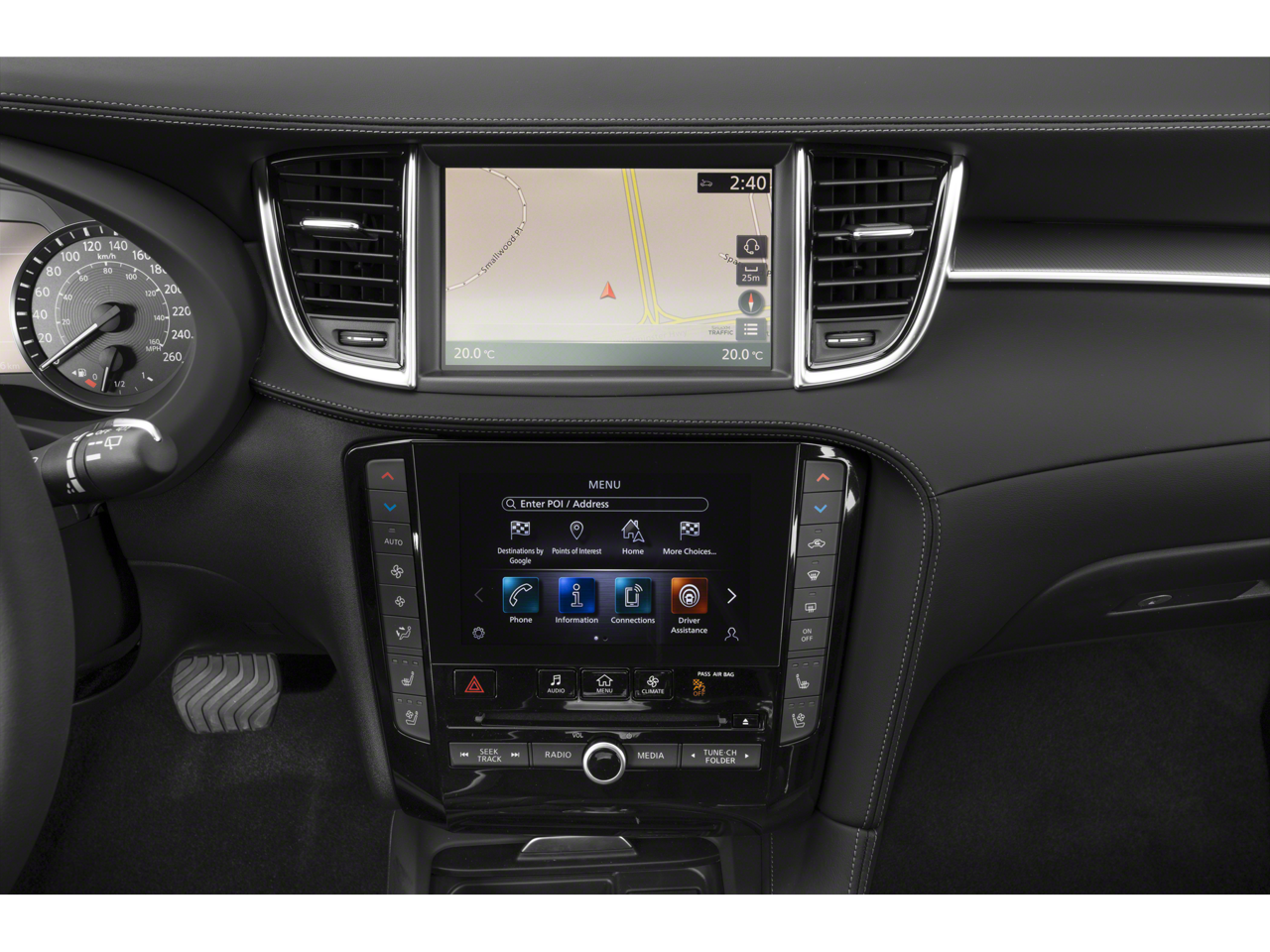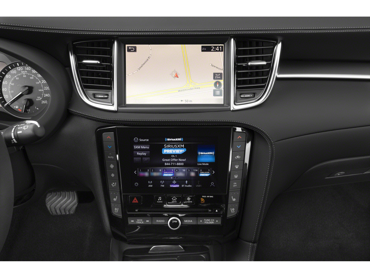 - Radio: Bose Performance Series Premium Audio -inc: 16 speakers, metallic speaker grilles on tweeters, INFINITI InTouch dual display system w/upper 8" and lower 7" HD touch screens, wireless Apple CarPlay and Android Auto, HD Radio technology, SiriusXM radio w/advanced audio features and 90-day complimentary trial, INFINITI voice recognition, INFINITI InTouch services, Siri eyes free, WiFi hotspot, navigation w/3D building graphics including 5-year complimentary access to premium traffic and MapCare, SiriusXM Traffic w/3 month complimentary trial access to real-time traffic information and SiriusXM Travel Link w/3 month complimentary trial access to weather, fuel prices, stock prices, sport scores, movie listings and parking
