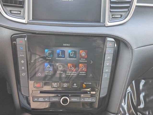 - Radio: HD Audio System -inc: 6 speakers, INFINITI InTouch, INFINITI InTouch services, INFINITI InTouch dual display system w/upper 8" and lower 7" HD touch screens, wireless Apple CarPlay, Android Auto, HD Radio technology, SiriusXM radio w/advanced audio features and 90-day complimentary trial, SiriusXM Travel Link w/90-day complimentary trial, INFINITI voice recognition, Siri Eyes Free, Wi-Fi hotspot, active noise cancellation, Bluetooth® hands-free phone system and streaming audio via Bluetooth®