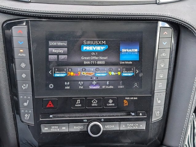 - Radio: Bose Performance Series Premium Audio -inc: 16 speakers, metallic speaker grilles on tweeters, INFINITI InTouch w/navigation and dual display system w/upper 8" and lower 7" touch screens, wireless Apple CarPlay, Android Auto, HD Radio technology, SiriusXM radio w/advanced audio features and 90-day complimentary trial, SiriusXM Traffic w/3-month complimentary trial, SiriusXM Travel Link w/3 months complimentary trial, INFINITI voice recognition, INFINITI InTouch services, Siri eyes free and Wi-Fi hotspot